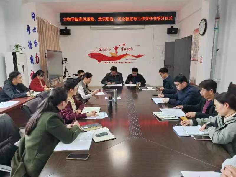 2024年4月7日,力物学院举行2024年度责任书签订仪式。会议由学院党委书记孙东升主持,学院党政领导班子成员和各室安全责任人、各党支部书记出席会议。